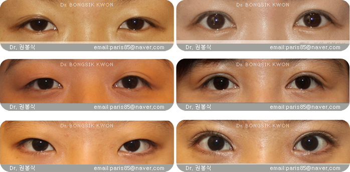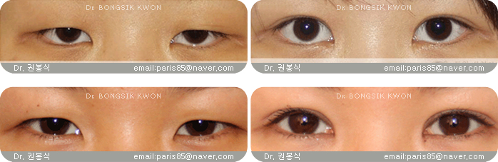 In a case both eyes are ptosis, it is difficult to correct as symmetry than the case only one is ptosis. After correcting severe ptosis, eyes does not be closed immediately after surgery, it can result in sleeping with opened eyes, but it is improved as times pass. When one does not want to make a double eyelid, it is possible to correct only ptosis, but very small hidden double eyelid will be made.