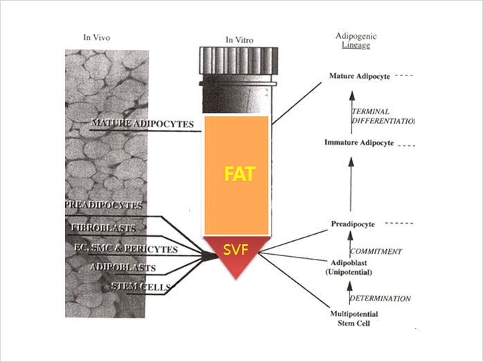 Stromal Vascular Fraction (as abbreviated as ‘SVF’) is cell complex, which contains fat-derived stem cell. If a plastic surgeon harvest fat from abdomen or thigh, serial washing and enzyme treatment performed to make SVF, which contains adipose-derived stem cells, enthothelial cells, red blood cells, interstitial tissue, other regenerative cells, various growth factors, angiogenesis factors, and several biologic enzymes.