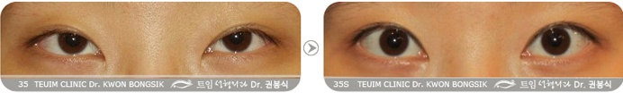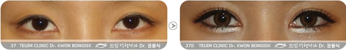 相对于右眼,左眼(图片上的右侧眼)的蒙古褶程度更深的情况下,右眼在有蒙古褶的情况下施行欧式双眼皮导致眼部线条看起来很别扭、不自然且会越来越淡。右眼双眼皮线条消失的可能性很大。 左眼因为蒙古褶而呈内双状态。在蒙古褶紧张力强却不施行开内眼角手术而直接做双眼皮手术时,一般都将手术设计成左眼那种窄双眼皮。