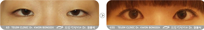 相对于右眼,左眼(图片上的右侧眼)的蒙古褶程度更深的情况下,右眼在有蒙古褶的情况下施行欧式双眼皮导致眼部线条看起来很别扭、不自然且会越来越淡。右眼双眼皮线条消失的可能性很大。 左眼因为蒙古褶而呈内双状态。在蒙古褶紧张力强却不施行开内眼角手术而直接做双眼皮手术时,一般都将手术设计成左眼那种窄双眼皮。
